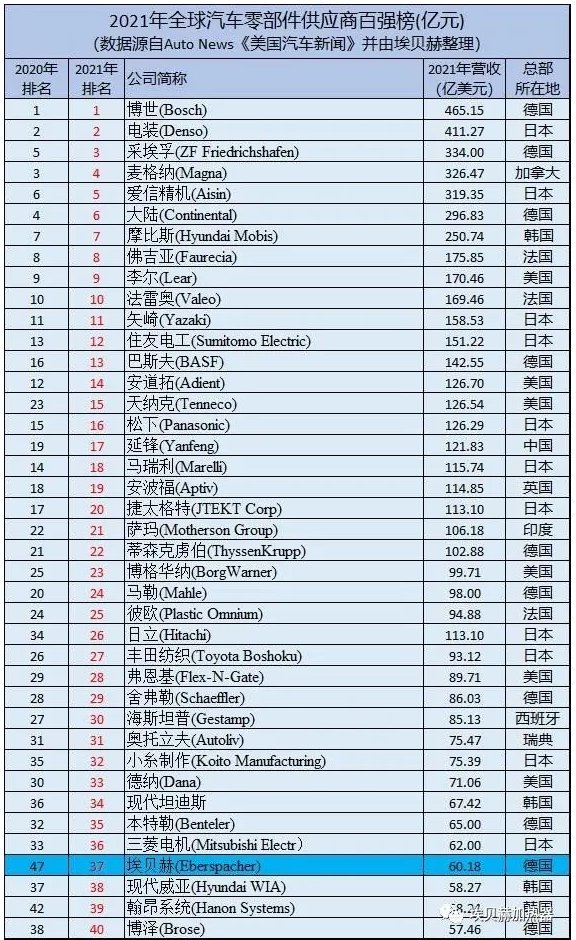 2021年是充满挑战的一年,埃贝赫团队在重重压力下,依然取得了优异的成绩。在2021年全球汽车零部件供应商百强榜上,较2020年排名提升了10位,从2020年的第47名,越至2021年的第37名。埃贝赫与客户们一起,携手共同面对疫情、芯片短缺等多方面压力。2022年也将会是充满挑战同样也会是充满机遇的一年。埃贝赫将一如既往,脚踏实地,紧跟时代步伐,不负韶华,砥砺前行。