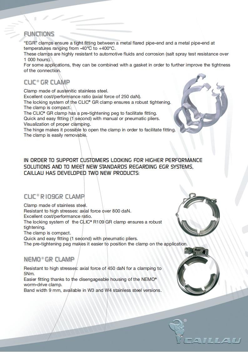 EGR clamps ensure a tight fitting between a metal flared pipe-end and a metal pipe-end at temperatures ranging from -40°C to +400°C.
