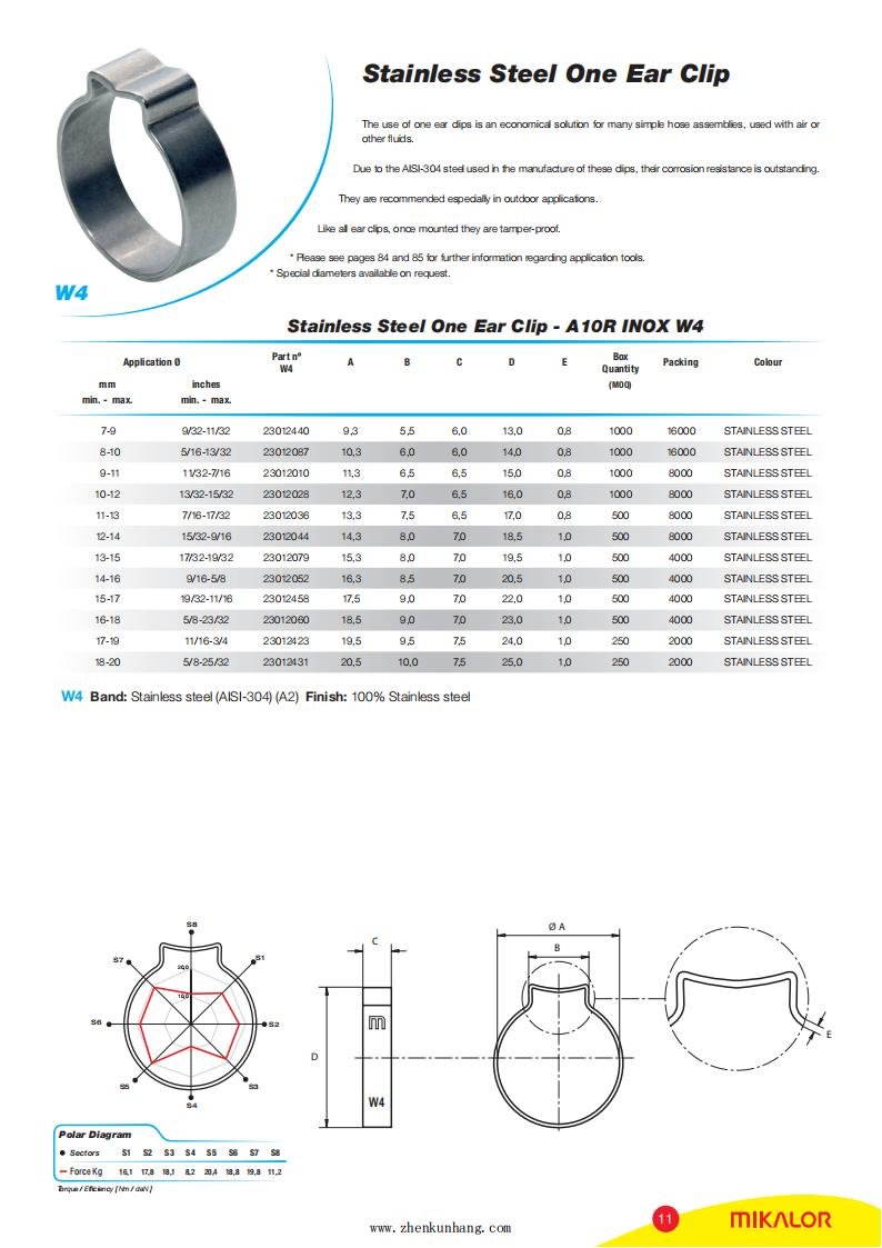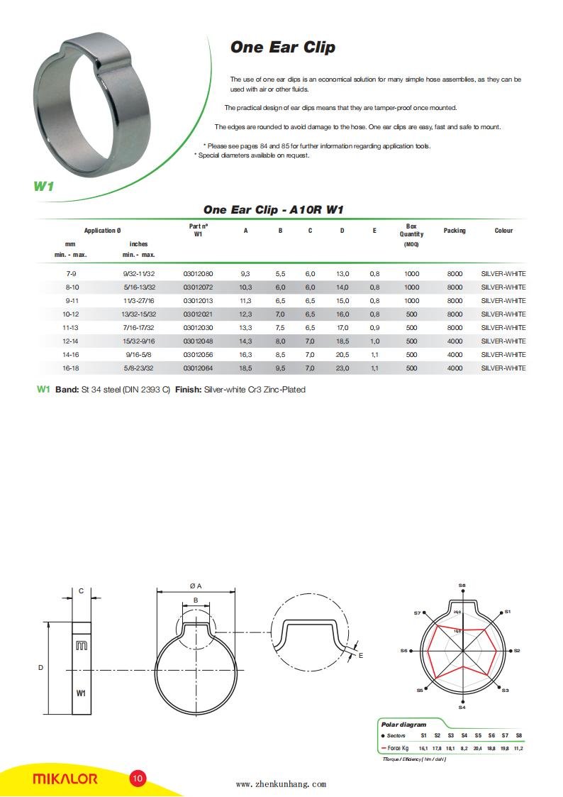 W1 Band: St 34 steel (DIN 2393 C) Finish: Silver-white Cr3 Zinc-Plated One Ear Clip - A10R W1 The use of one ear clips is an economical solution for many simple hose assemblies, as they can be  used with air or other fluids.