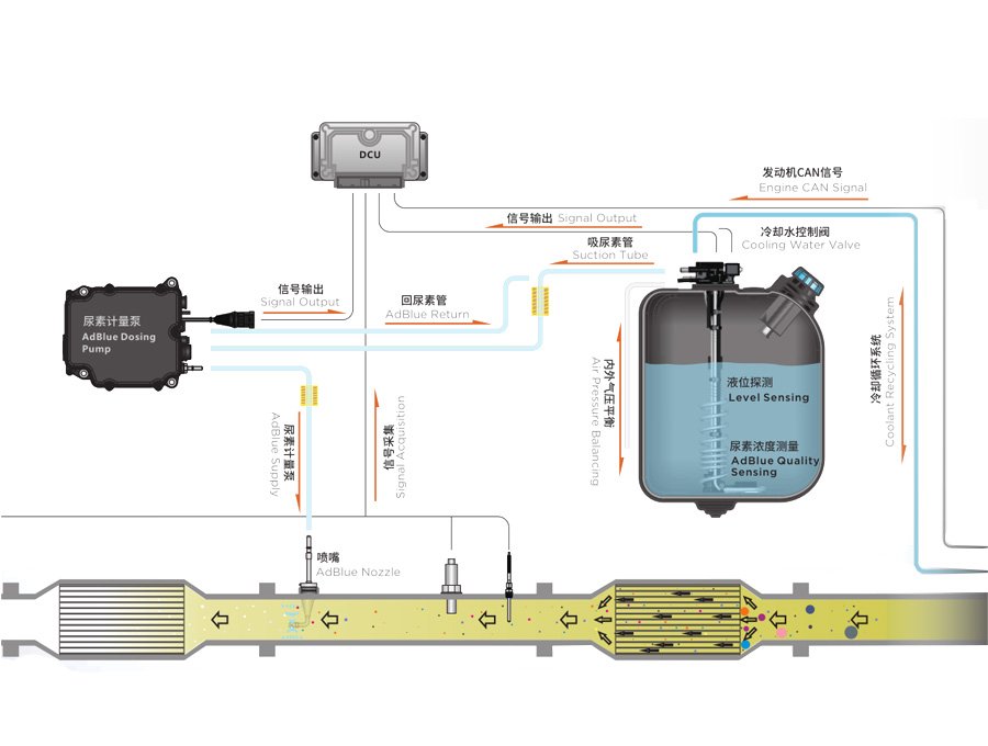 SCR系统原理是利用车用尿素水溶液与氮氧化物NOx 进行反应,生成无污染的氮气(N2)和水(H2O)。