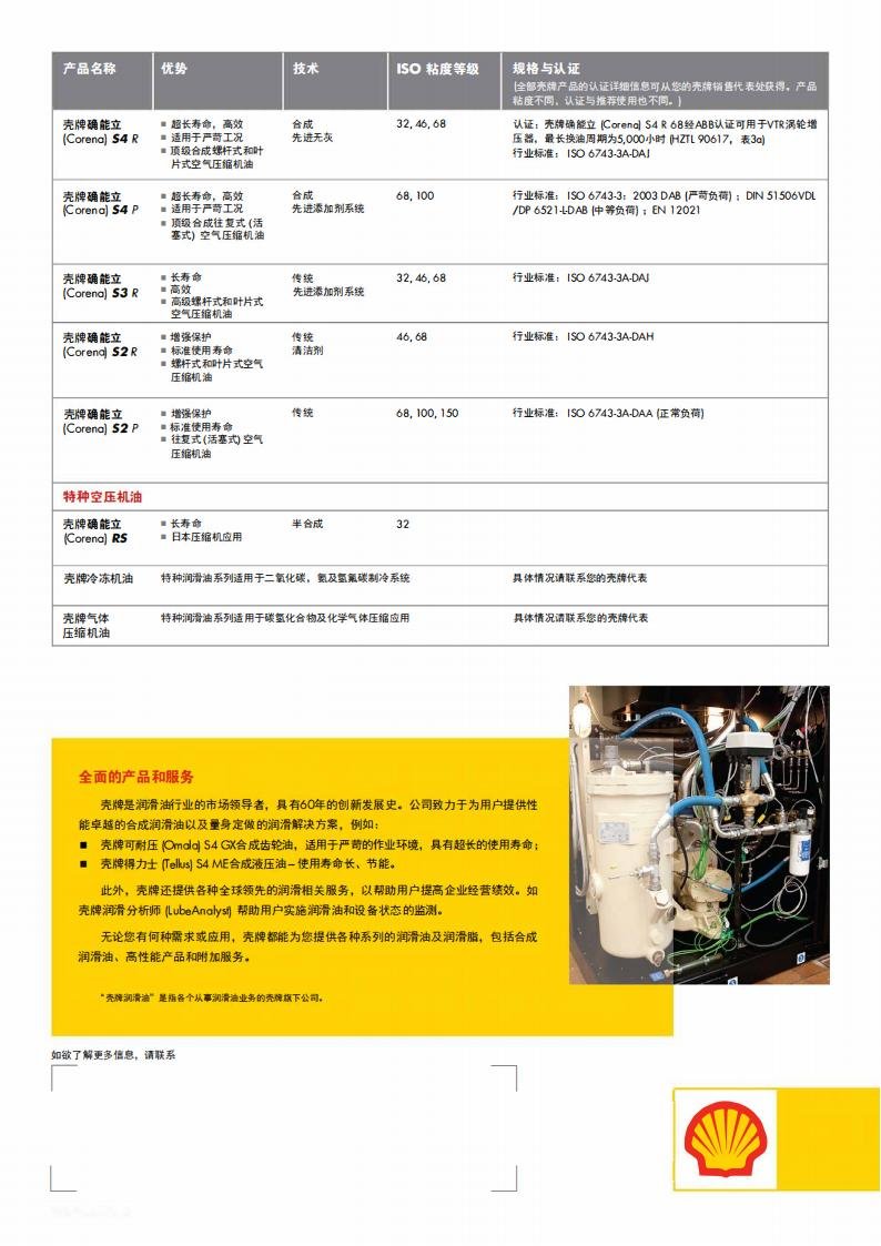 过度供损会严重影响到空气压缩机的使用寿命及效率,壳牌确能立/Corena)系列空气压缩机油含专业的回转式空气压缩机油以控制叶片及螺杆的磨损,而往复式空气压缩机油特别用于控制油缸、活塞环及阀门的磨损。无论您拥有何种技术需求及操作条件,总会有一款壳牌油品能够协助您,让您的设备投入得到最大限度的利用。壳牌确能立(Corena系列空气压缩机油含最新的合成油。能提高高温工况及延时作业时的磨损保护。