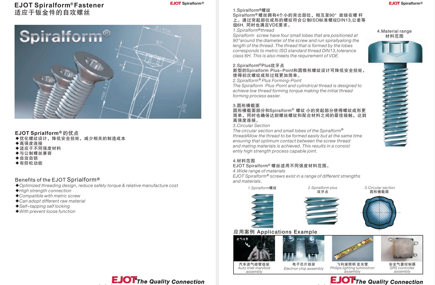 圆形横截面部分和Spiralform①螺纹 小的突起部分使得螺纹成形更简单,同时也确保达到螺丝螺纹和配合材料之间的最佳接触,达到高强度连接。